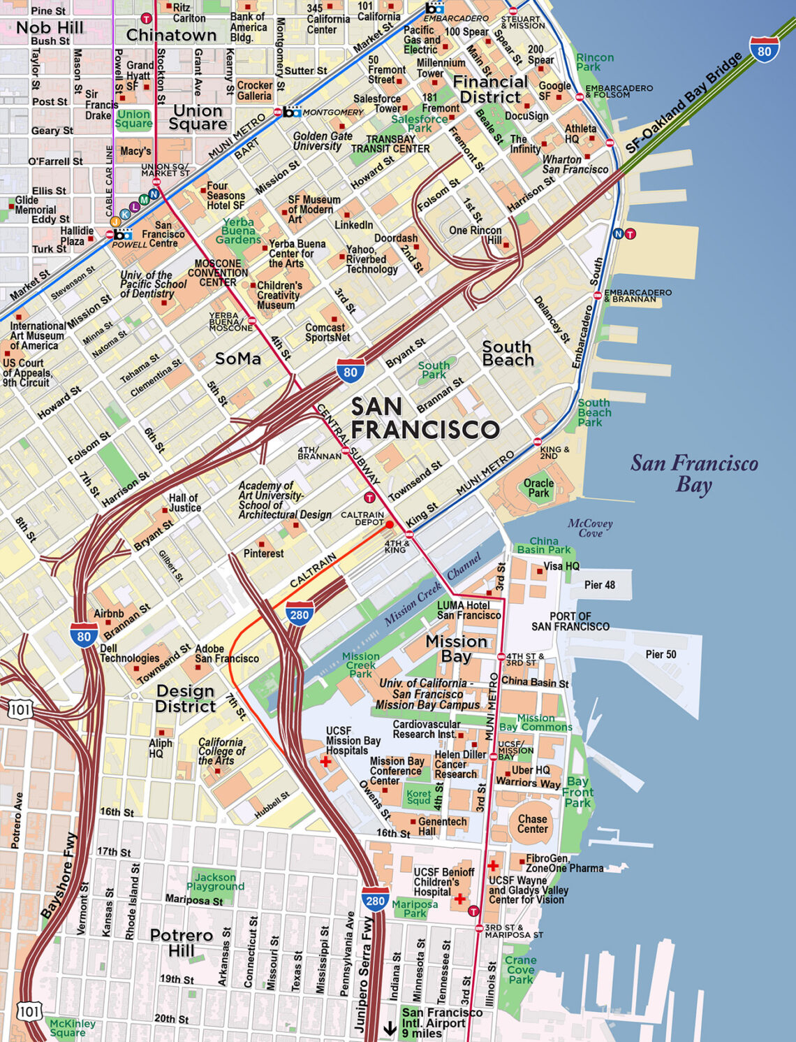 A zoomed-in view of Downtown San Francisco, concentrating on the Financial District, SoMa, South Beach and Mission Bay.
