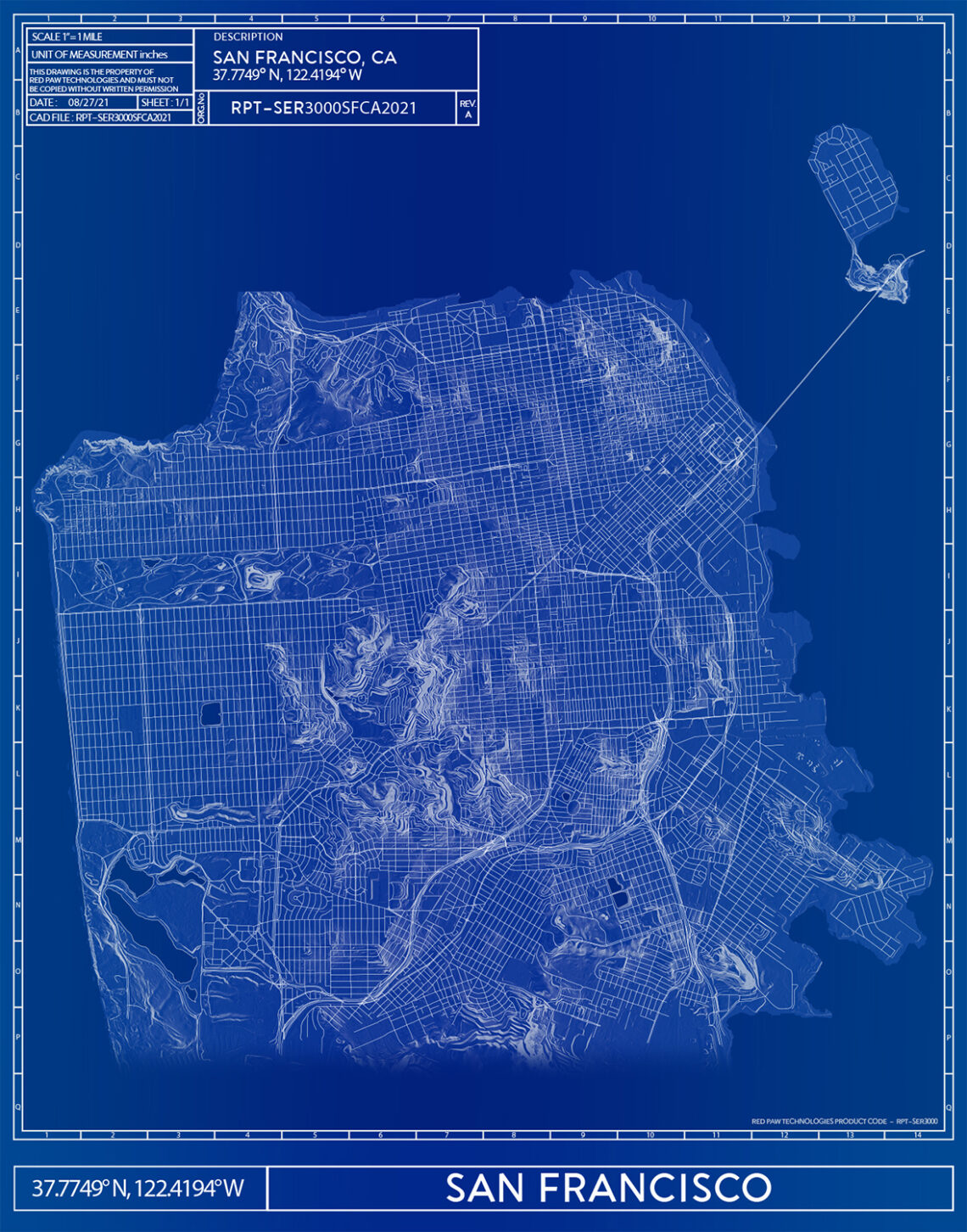 A custom, decorative “blueprint style” map made for printing and framing.